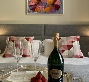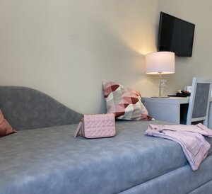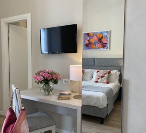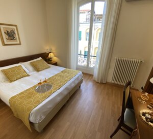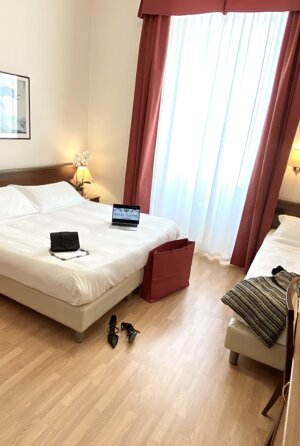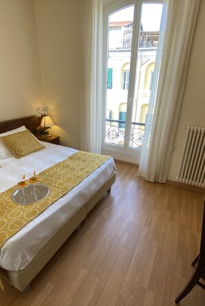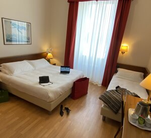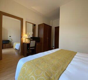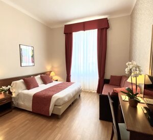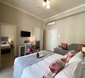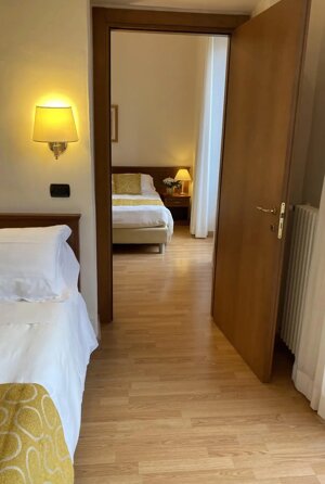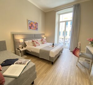 Zimmer für drei Personen mit einem Doppelbett und einem Einzelbett. Es ist möglich, bei der Buchung die Möglichkeit eines vierten Bettes für ein Kind anzufordern. Urban oder klassisch eingerichtet. Sie blicken auf die Fußgängerzone der Altstadt oder auf den Innengarten. Einige Dreibettzimmer bestehen aus zwei miteinander verbundenen Zimmern, darunter ein Doppel- und ein Einzelzimmer, alle mit Blick auf die Altstadt.